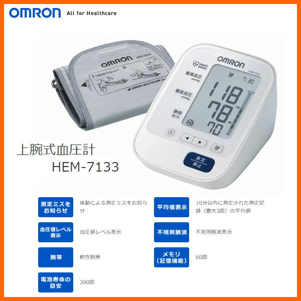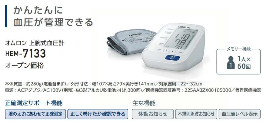 OMRON HEM-7133 オムロン 上腕式血圧計 HEM-7130シリーズ 適応腕周:22〜32cm 【製品仕様】 品番 HEM-7133 [HEM7133] 本体寸法 幅107×高さ79×奥行き141mm 本体重量 約280g (電池含まず) 単3形アルカリ乾電池×4、専用ACアダプタ(別売) 医療機器認証番号 225AABZX00105000 測定可能上腕周囲 約22〜32cm 付属品 腕帯(軟性腕帯)、お試し用電池(単3アルカリ乾電池×4)、取扱説明書(品質保証書付き)、医療機器添付文書、EMC技術資料 特徴 ■カフが正しく巻けたかどうかを確認「カフぴったり巻きチェック」 正確に血圧を測定するには、カフ(腕帯)を腕にしっかりと巻くことが大切です。