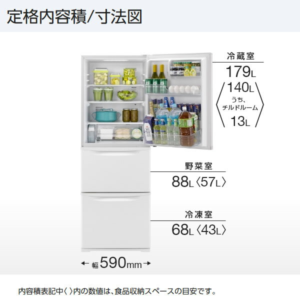 ■ Panasonic ■◆ 主な特長 ◆◆ 主な仕様 ◆各室容量冷蔵室:179L野菜室:88L冷凍室:68L外形寸法幅590×奥行633×高さ1,678mm必要設置スペース幅600×奥行645×高さ1,728mm質量68kg年間消費電力量(50/60Hz)330kWh/年(JIS C 9801-3:2015)