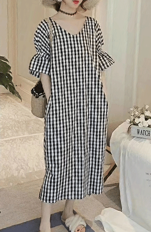 ワンピース 半袖 ロング 夏 前後2Way フレアスリーブ レディース ロングチュニック 深Vネック ミモレ丈 ワンピ 韓国 ファッション フリル袖 大人 かわいい シンプル ナチュラル服 コットン ゆったり プルオーバー 大きめ ママ 服 背中あき ギンガムチェック[spd]